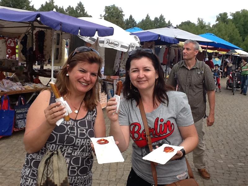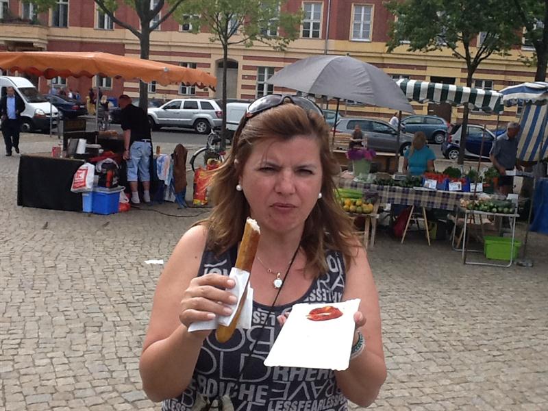 Almoçamos o tradicional salsichão na própria estação de potsdam.